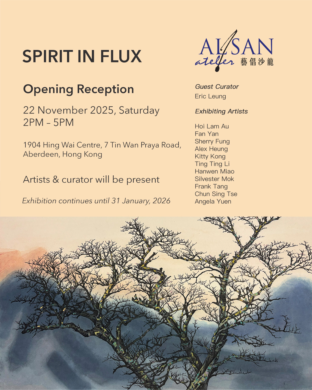Alisan Atelier is pleased to announce Spirit In Flux, a special group exhibition of 11 artists inspired by and engaging with the innovative spirit championed by the founder of Hong Kong’s New Ink Movement, Lui Shou-kwan. Participants include Au Hoi-lam, Fan Yan, Fung Hoi-shan, Sherry, Heung Kin-fung, Alex, Kong Chun-nga, Kitty, Li Tingting, Miao Hanwen, Mok Hoi-ching, Silvester, Tang Kai-yiu, Frank, Tse Chun-sing, and Yuen Ka-yee, Angela They each chart their own course in artistic innovation, directly and indirectly respond to the legacy of Lui Shou-kwan, which is currently celebrated in a landmark solo exhibition at Alisan Fine Arts’ Central Hong Kong gallery.