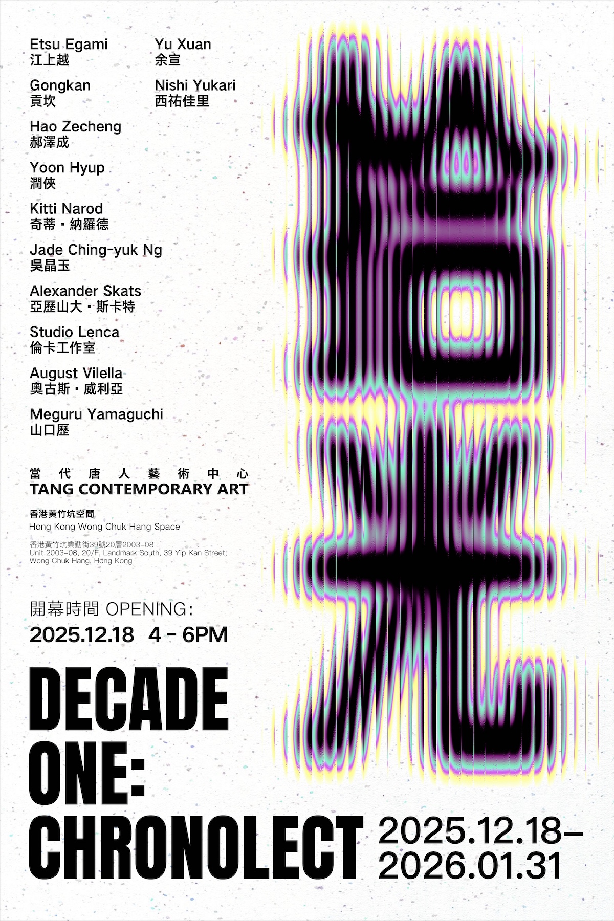 In the Wong Chuk Hang space, showcases seven voices of international resonance including, Etsu Egami dissolving language into prismatic veils of misheard faces, Hao Zecheng exhaling blurred photographs until streetlamps ignite as silent fireworks, Yoon Hyup letting the city improvise through his wrist in endless vibrating lines, Kitti Narod suspending strangers and animals in the soft gravity of kindness, Jade Ching-yuk Ng painting the trembling half-inch of air between almost-touching bodies, Nishi Yukari staging a borrowed American dream inside faceless Japanese dolls, and Meguru Yamaguchi assassinating the rectangle to set the brushstroke free converge across continents, generations, and media to sketch the living ecosystem of contemporary painting. Alexander Skats reframes digital imagery into a vibrant critique of consumption, beckoning viewers to reevaluate beauty in the modern world, while August Vilella’s surreal intuitions craft dreamlike narratives with whimsical characters that invite introspection through their expressive gazes. Yu Xuan juxtaposes the charm and monotony of contemporary life, layering animal imagery over designed objects to form a strange aesthetic that mirrors society’s complexities. Their juxtaposition gives visible form to the “Chronolect”: a private dialect of time forged across one decade of restless practice. This is not a retrospective, but a single shared breath; ten irreconcilable tongues speaking the same urgent future, reflecting the pulse of contemporary art from Hong Kong to the world and heralding, in trembling pigment, the shape of the decade yet to come. Their juxtaposition gives visible form to the “Chronolect”: a private dialect of time forged across one decade of restless practice. This is not a retrospective, but a single shared breath seven irreconcilable tongues speaking the same urgent future, reflecting the pulse of contemporary art from Hong Kong to the world and heralding, in trembling pigment, the shape of the decade yet to come.