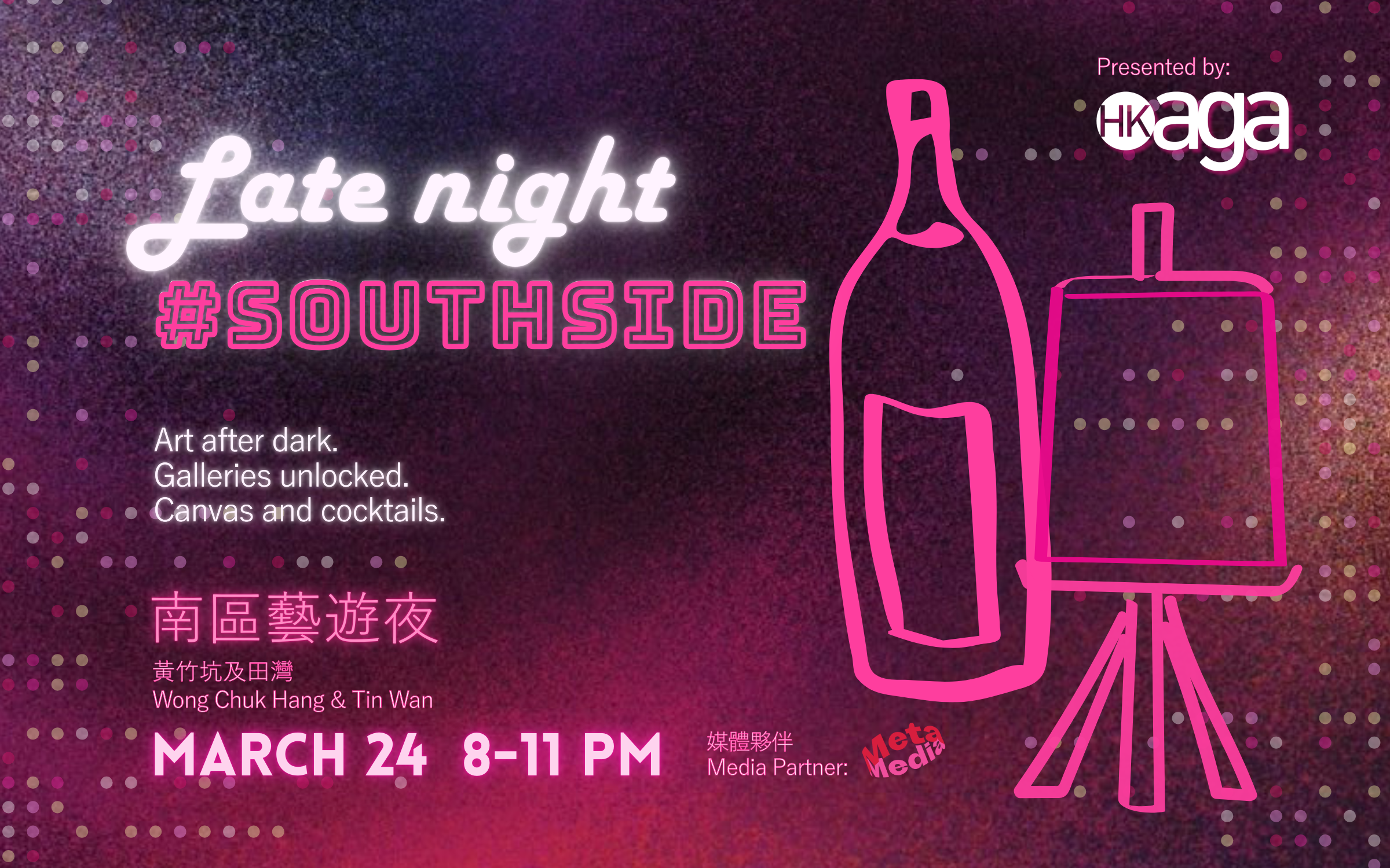 夜幕低垂,在黃竹坑與田灣的畫廊解鎖藝術與雞尾酒時光!✨🍸南區藝遊夜邀請您於3月24日晚上8點至11點在城市夜生活中體驗藝術,發現香港藝術界的新展覽。南區藝遊夜畫廊還將為藝術三月推出特別策劃的活動,如香港打擊樂手Karen Yu在Gold的表演。在十點半,鄧國騫將從《人間》展覽現場將他收集的民間舊物與民俗文化轉化為表演互動裝置。觀眾邀請加入他的「神遊」,一並從空間出發、沿街道行走、至Current Plans演出現場。當晚也有超媒體集團的展覽及派對。探索當代藝術家張小黎在藝倡沙龍的首次個人展覽;賢藝匯的開幕活動;不要錯過在WKM Gallery與加拿大攝影師Greg Girard交流。盡情享受這個夜晚,留意沿途粉紅交通錐就會發現參與活動畫廊/藝術空間!🩷🍸